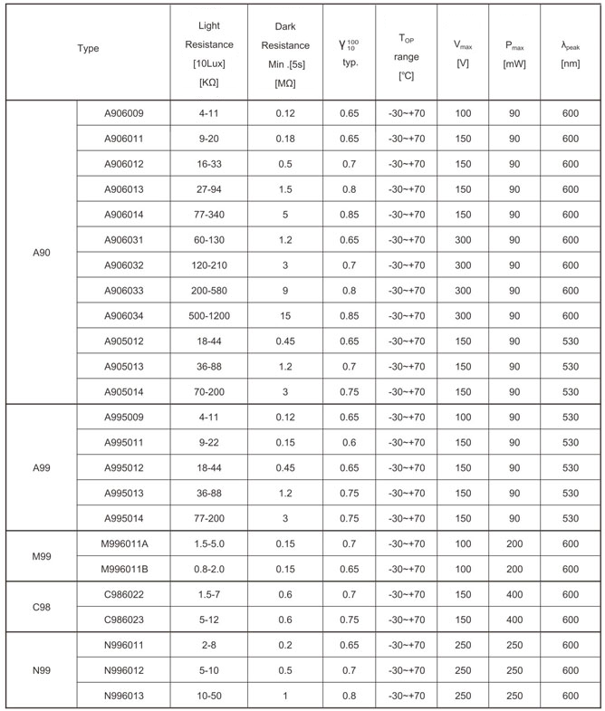A90 series photoresistors