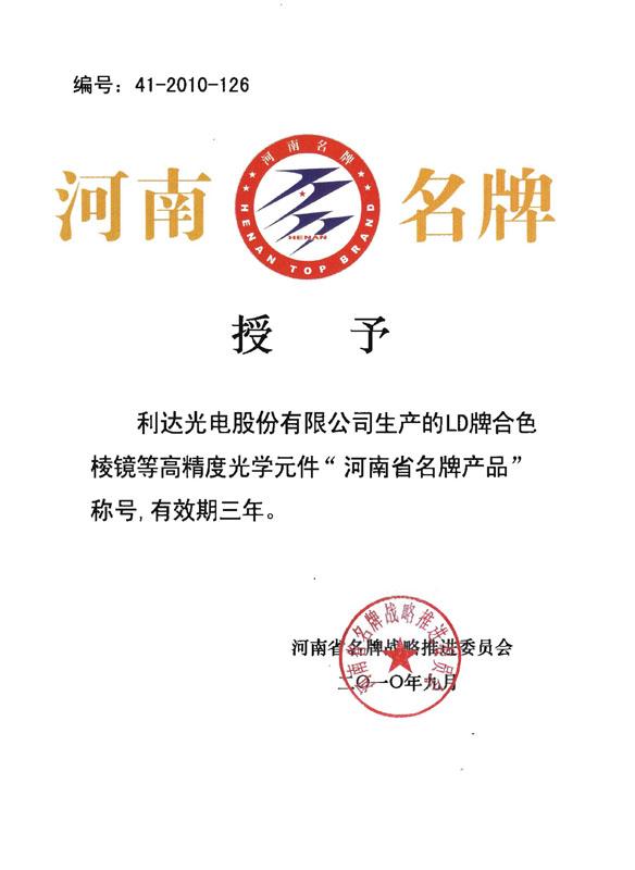 利達光電“LD”牌高精度光學(xué)元件榮獲河南省名牌產(chǎn)品