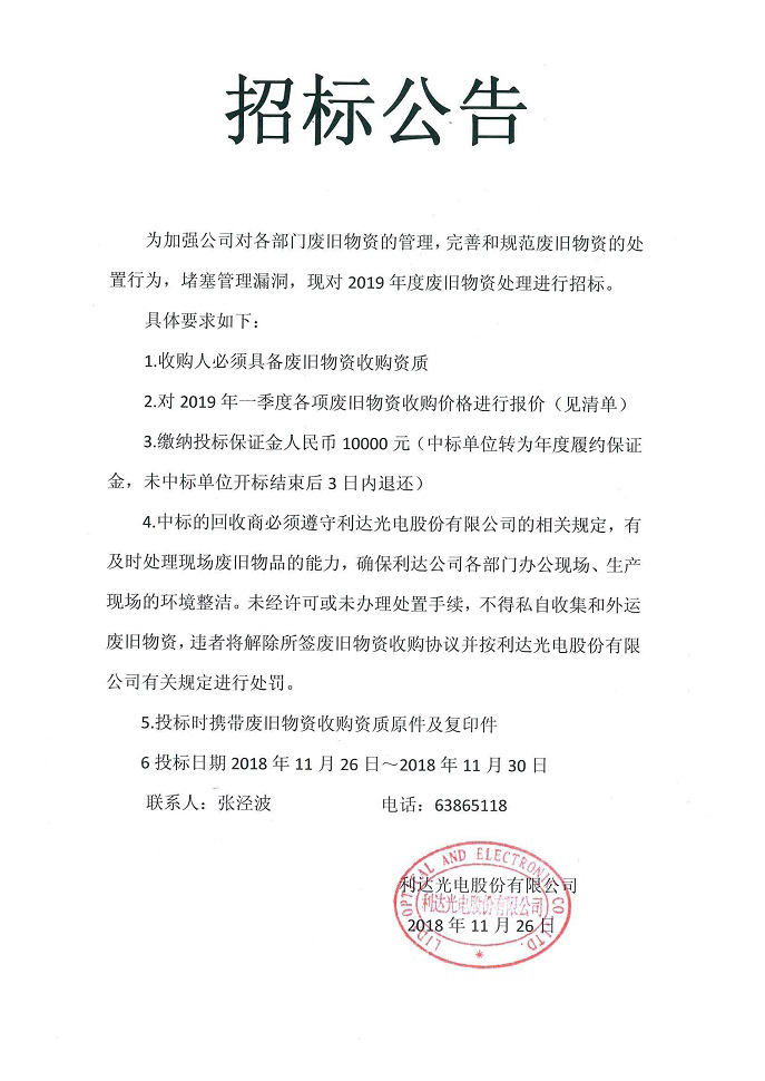 2019年度廢舊物資處理招標公告