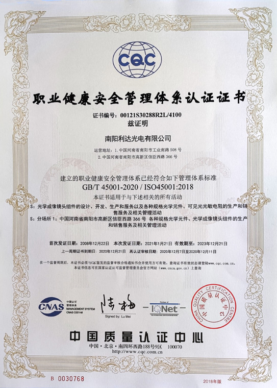 職業(yè)健康安全管理體系認證證書(shū)(中文)
